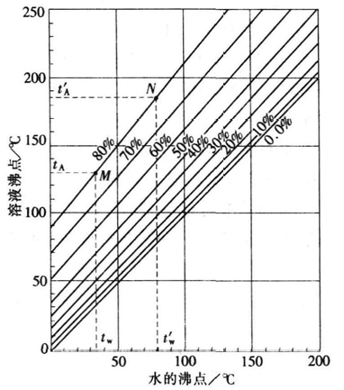 式中 \(k\) - 杜林直线的斜率,量纲为1; \(t_{A}\)、\(t_{w}\) - 分别为压力 \(P_{M}\)下溶液的沸点与纯水的沸点,\(\rm{ °C }\); \(t_{A}'、t_{w}'\)- 分别为压力 \(P_{N}\)下溶液的沸点与纯水的沸点,\(\rm{ °C }\)。